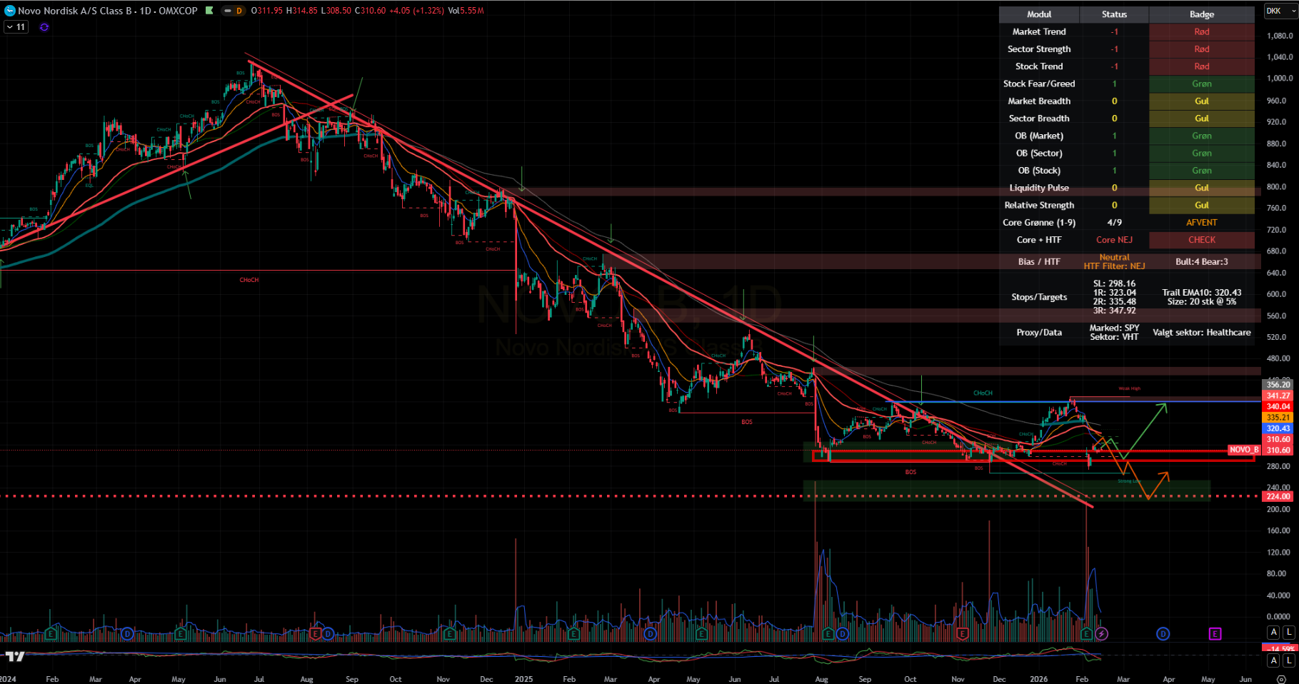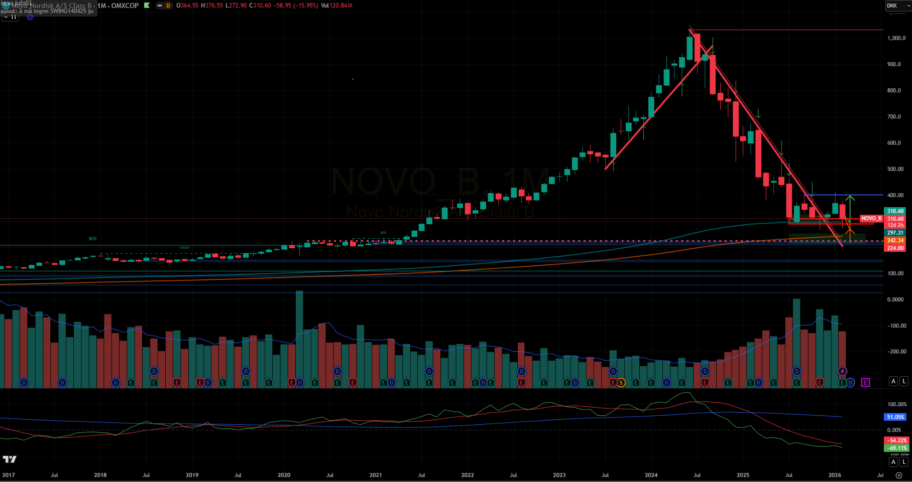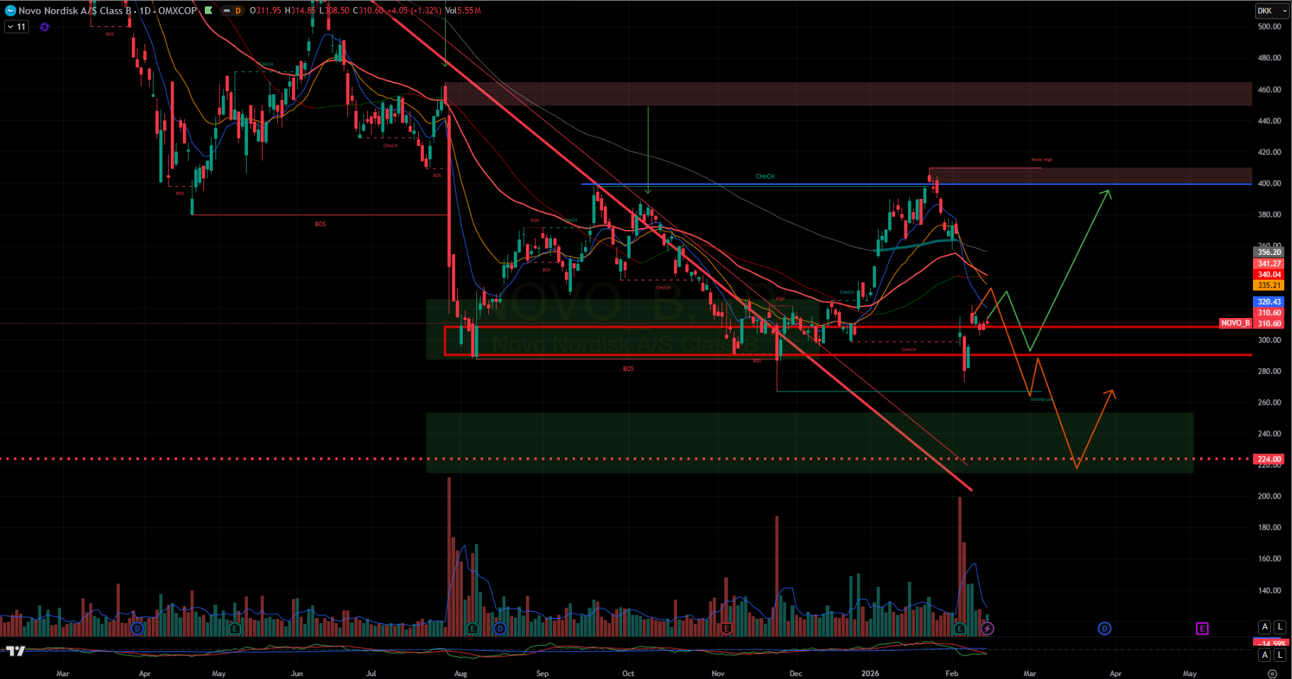 Efter regnskabet i Novo Nordisk blev området omkring 300 hurtigt bekræftet som et afgørende teknisk niveau. Det er ikke usædvanligt, at markedet efter store nyheder søger mod tidligere likviditetszoner, hvor både købere og sælgere allerede har vist interesse.