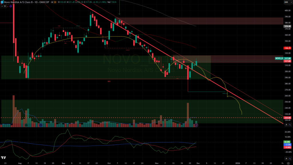 Grafen viser fortsat, at Novo ligger i en tung bearish struktur, og vi nærmer os et af de mest kritiske tekniske zoner aktien har haft de sidste 5 år: 300-området.(290-320)
